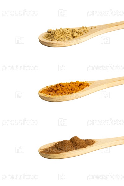 Набор сухих, молотых специй в ложках на белом фоне: корица, имбирь, куркума. Изолировано