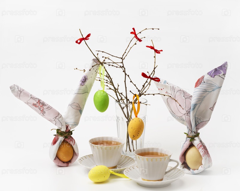 Винтажные чашки чая и пасхальные украшения на белом фоне. Белые чашки и яйца, украшенные салфетками в виде зайцев на белом фоне