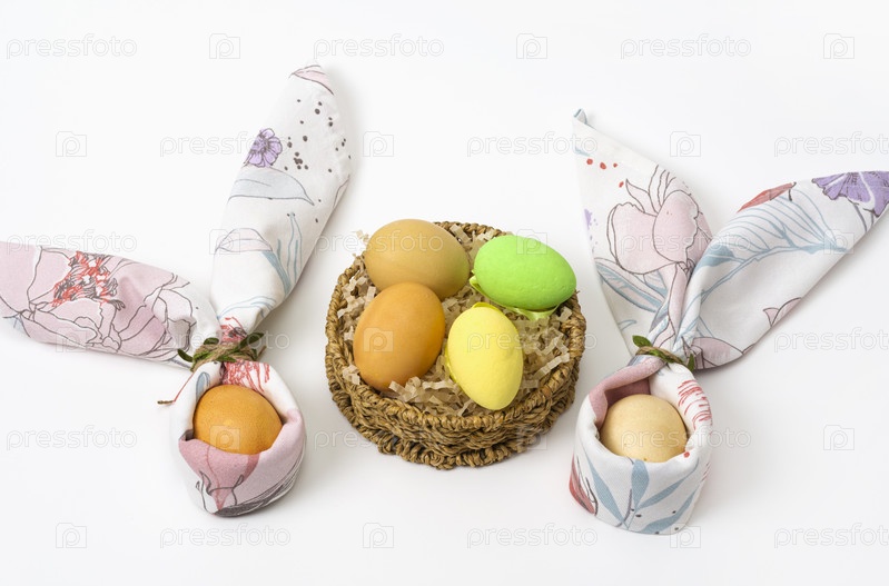 Пасхальные яйца, украшенные салфетками в форме кролика на белом фоне. Сервировка пасхального стола