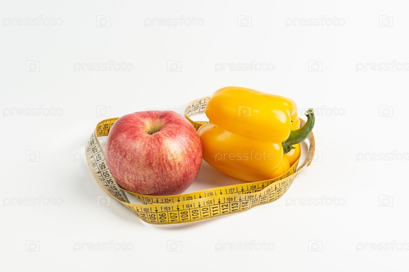 Диетическая еда со свежими фруктами и овощами и измерительной лентой на белом фоне. Концепция потери веса и детоксикации