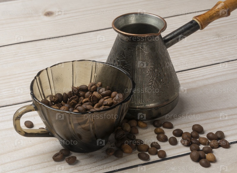На столе стоит стеклянная чашка с черными кофейными зернами и турка