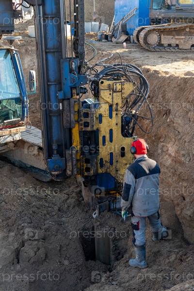 Рабочий контролирует извлечение шпунта Ларсена из земли
