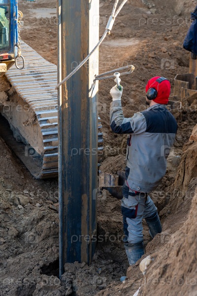 Рабочий контролирует извлечение шпунта Ларсена из земли