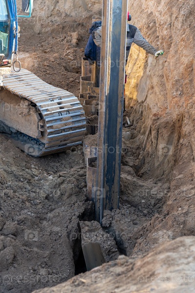 Желтый гидравлический сваебойный агрегат устанавливает дюбели Ларсена после извлечения их из грунта по завершении земляных работ на большой глубине