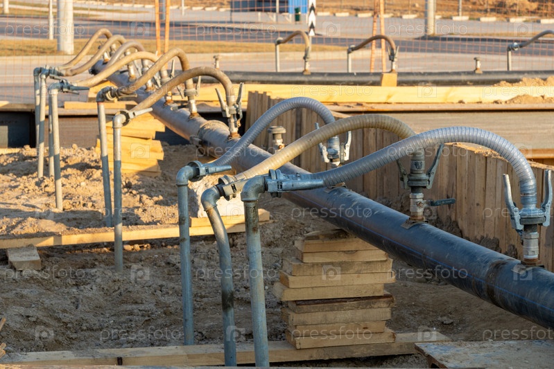 Крупный план ряда гибких шлангов, соединенных с трубой на строительной площадке
