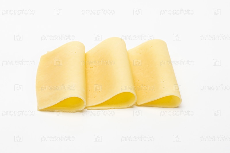 Три ломтика сыра сложены на белой поверхности