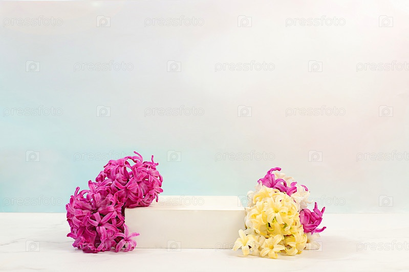 Абстрактная красивая цветочная композиция с гиацинтами, баннер. Пустой подиум для продуктов и свежие живые весенние цветы. Сцена для бизнес-концепции. Минимальная современная эстетика и элегантная концепция красоты,