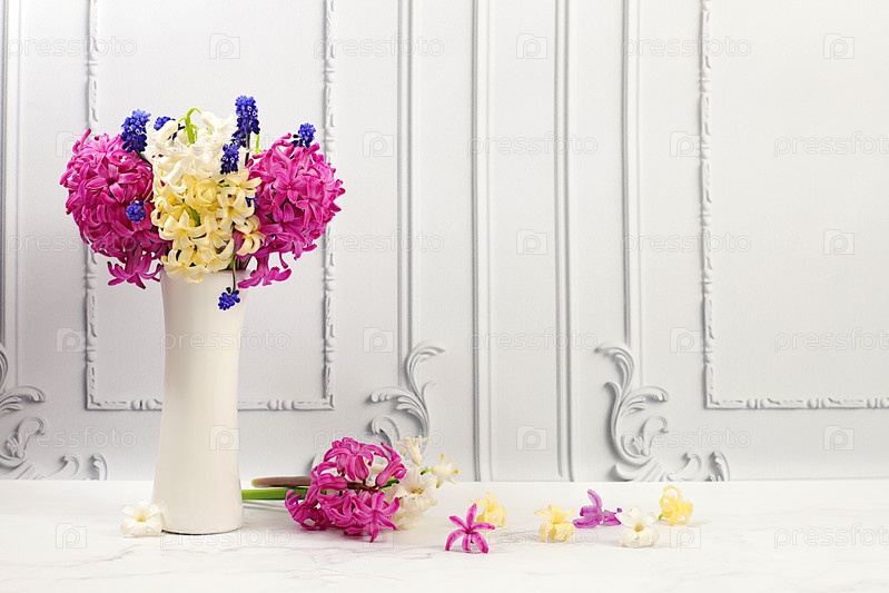 Красивый натюрморт из разных сортов гиацинтов и мускари в вазе на элегантном кухонном фоне, шаблон для дизайна и экрана. Абстрактная цветочная композиция, баннер. Весенняя открытка, визитная карточка для демонстрации продукта
