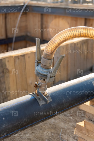 Крупный план гибкого шланга, подсоединенного к трубе на строительной площадке