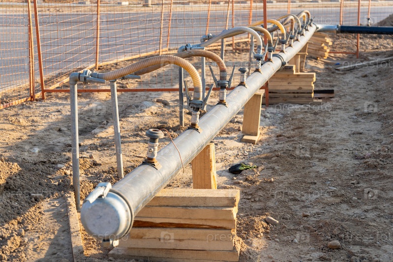 Крупный план ряда гибких шлангов, соединенных с трубой на строительной площадке