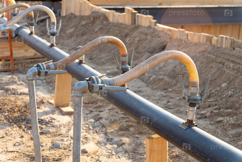 Крупный план ряда гибких шлангов, соединенных с трубой на строительной площадке