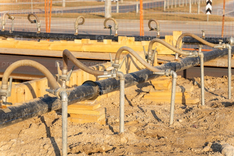 Крупный план ряда гибких шлангов, соединенных с трубой на строительной площадке