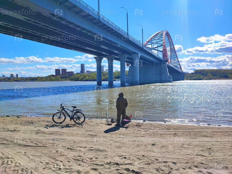 Рыбаклка. Бугринский мост в городе Новосибирск через реку Обь, весна. Bugrinsky bridge in Novosibirsk across the Ob River, spring. Bugrinsky桥在新西伯利亚横跨鄂毕河,春天。