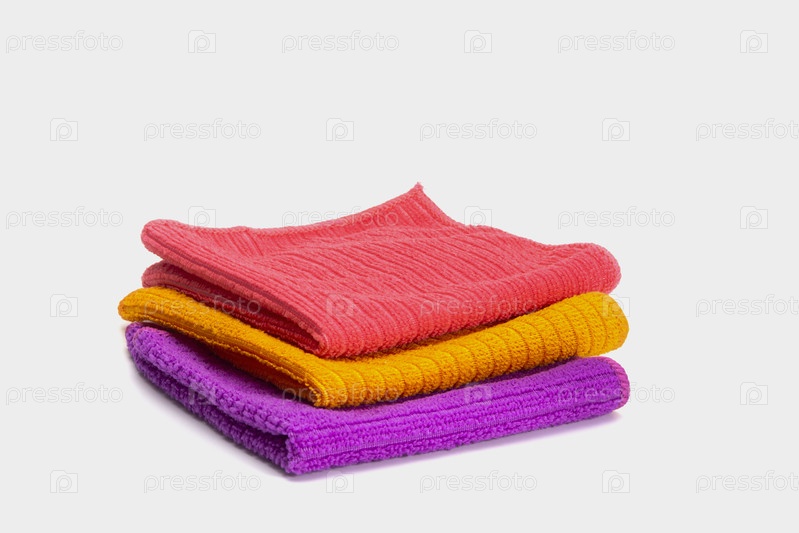 Три разноцветные бытовые тряпки для пыли на белом фоне