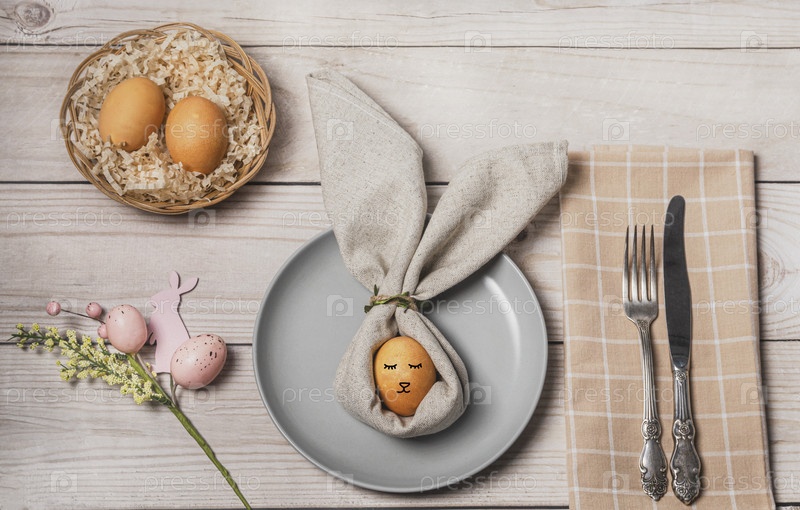 Праздничная сервировка пасхального стола. Ужин с кроликом и крашеными яйцами. Пастельные тона. Вид сверху. Христианская религиозная традиция