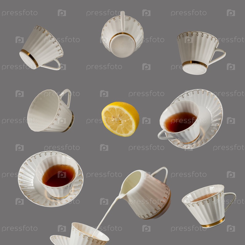 Летающий белый винтажный чайный сервиз и лимон на сером фоне. Левитация