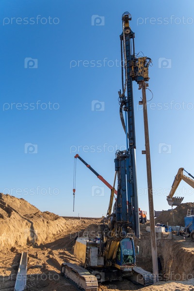 Желтый вибрационный сваебойный агрегат извлекает шпунтовые сваи Ларсена из земли