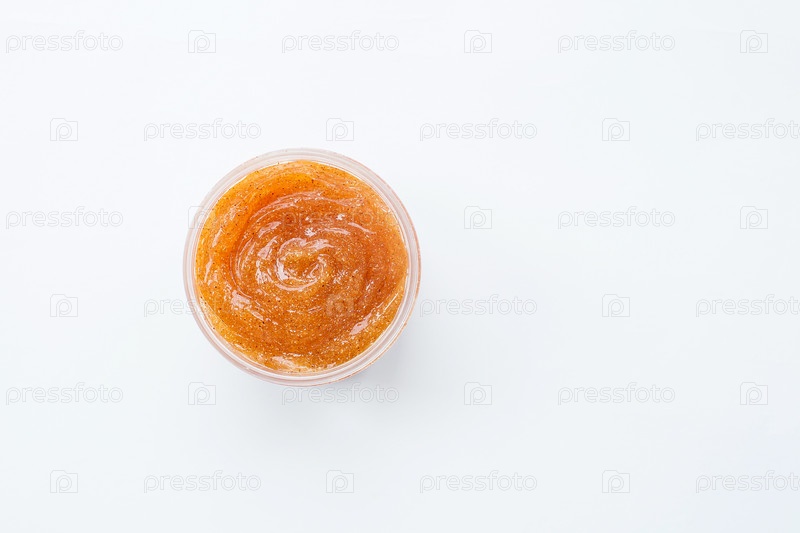 Спа-процедуры. Контейнер с натуральным скрабом на белом фоне, вид сверху. Концепция красоты и здоровья