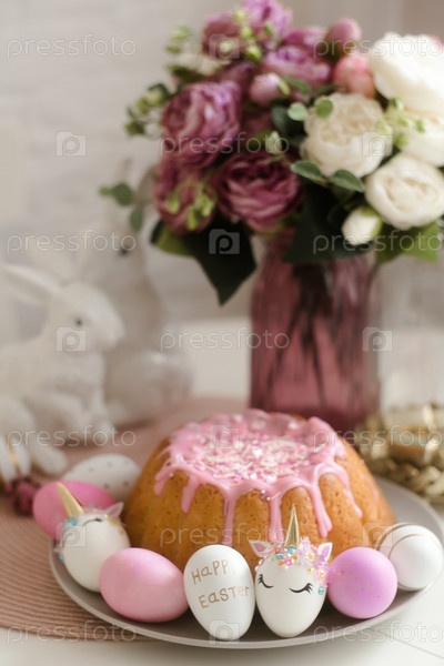 Баннер. Минимальная концепция. Пасхальный кулич, кролики и яйца в виде единорога и с золотым узором на белом столе. Копировать место для текста