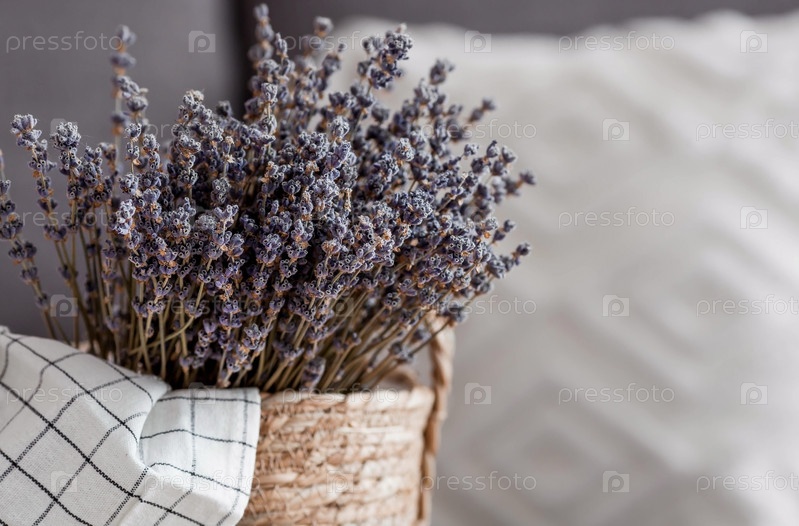Прованс. Плетеная корзина с букетом лаванды в интерьере гостиной крупным планом. Концепция домашнего уюта и декора в интерьере