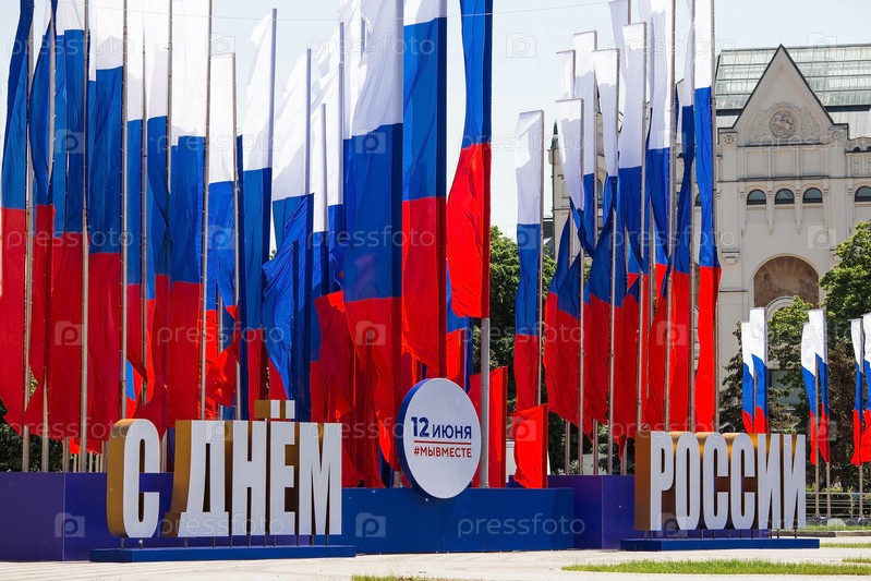 Россия. Москва. Государственный флаг Российской Федерации на фоне собора Василия Блаженного на Васильевском спуске. Российский триколор. Праздник — День России 12 июня