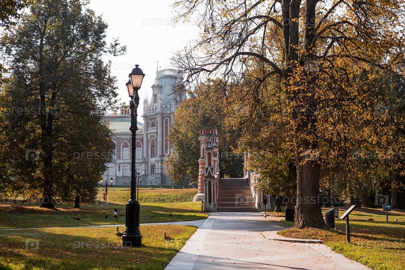 Россия, Москва. Фигурный мост в Царицыно в Москве осенним днем. Царицынский парк — одна из главных туристических достопримечательностей Москвы