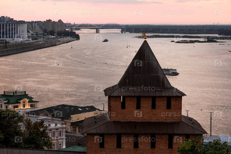 Россия, Нижний Новгород, 16 августа 2023 г. Вид на стены Нижегородского кремля и реку Волгу на закате