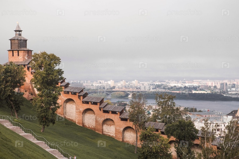 Россия, Нижний Новгород, 16 августа 2023 г. Вид на стены Нижегородского кремля и реку Волгу на закате