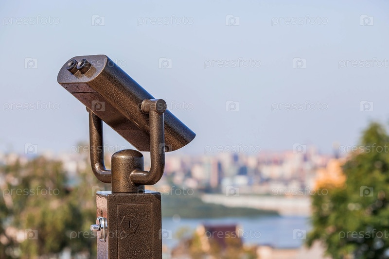 Бинокль на смотровой площадке с видом на судоходную реку Волгу в Нижнем Новгороде во время заката