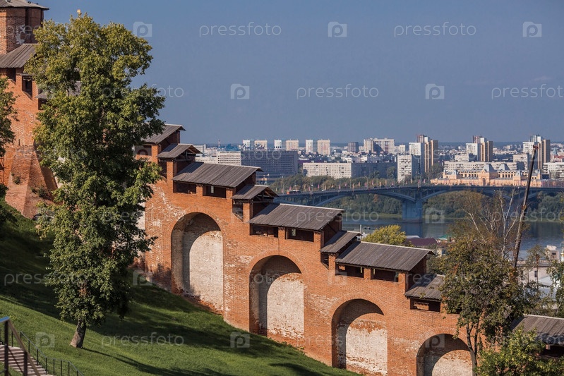 Россия, Нижний Новгород, 16 августа 2023 г. Вид на стены Нижегородского кремля и реку Волгу на закате