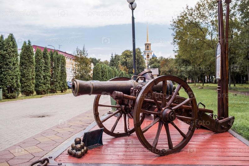 Россия, город Рязань. Инсталляция в виде мортиры и пушки на лафете. Парк Рязанского Кремля
