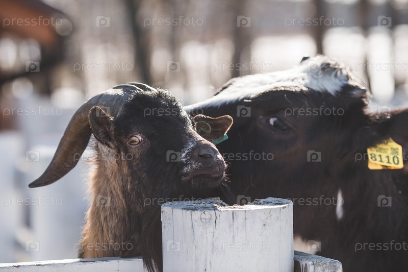Животноводство. Корова и козел в загоне. Концепция животноводства и сельской жизни. Чипирование животных. Чипы в ушах коровы. Питомец на частной экоферме. Сельскохозяйственная промышленность