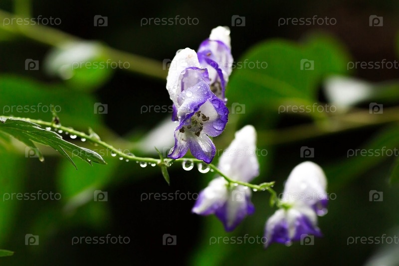 Aconitum cammarum bicolor. Естественная свежесть. Текстура растения с каплями дождя. Натуральный зеленый естественный фон. Летний дождь