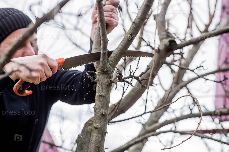 Обрезка веток плодового дерева садовой пилой. Ручная пила в руках мужчины. Крупный план распиловки деревьев, Уход за деревьями. Садоводство. Подготовка сада к летнему сезону
