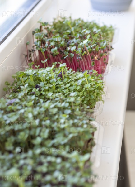 Свежие проросшие ростки микрозелени в пластиковых контейнерах на джутовом коврике. Размещены на подоконнике балкона современной квартиры. Фото с мягким выборочным фокусом
