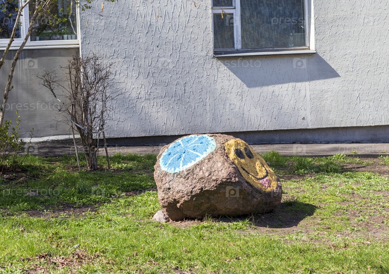 Смайлик, нарисованный на большом камне на открытом воздухе. Концепция