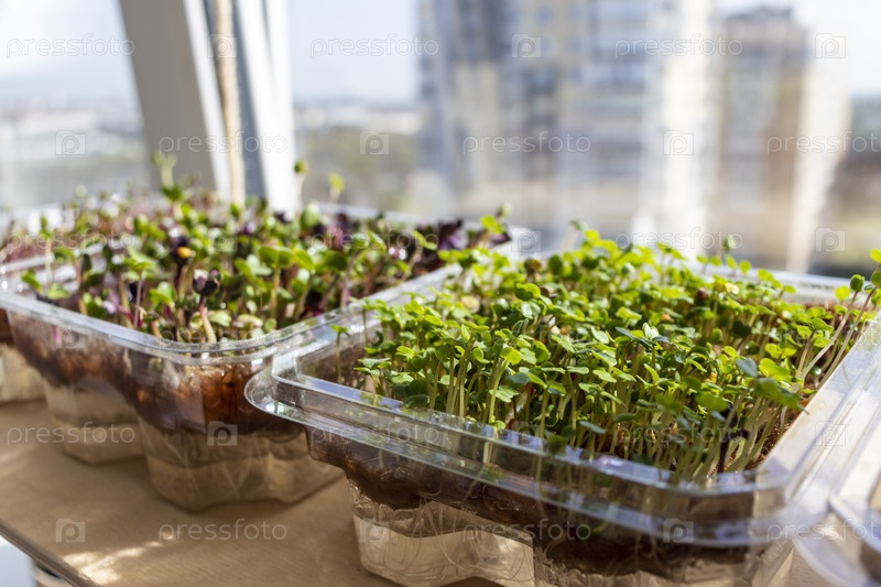 Свежие проросшие ростки микрозелени в пластиковых контейнерах на джутовом коврике. Размещены на деревянной полке на балконе современной квартиры. Образ жизни