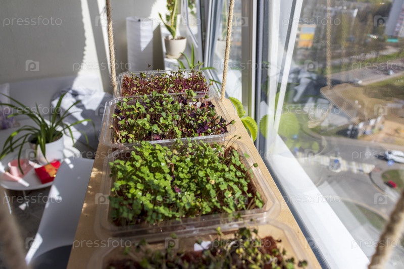 Свежие проросшие ростки микрозелени в пластиковых контейнерах на джутовом коврике. Размещены на деревянной полке на балконе современной квартиры. Образ жизни