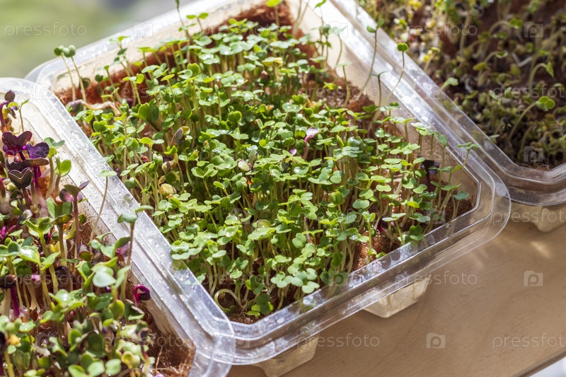 Свежие проросшие ростки микрозелени в пластиковых контейнерах на джутовом коврике. Размещены на деревянной полке на балконе. Хобби