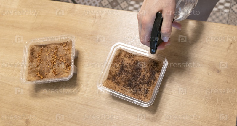 Человек поливает, опрыскивает семена микрозелени в джутовом коврике в пластиковом контейнере. Хобби