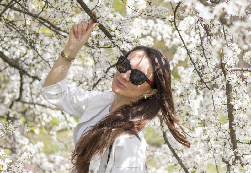Красивая женщина позирует для фото в цветущем саду. Люди