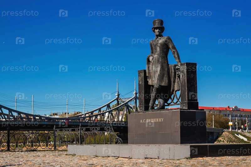 Тверь. Пушкин на мосту. Памятник русскому поэту Александру Сергеевичу Пушкину на фоне старого Волжского моста