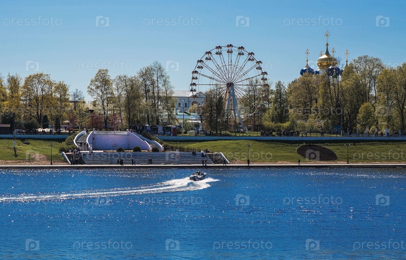 Городская набережная реки Волги в Твери. Парк развлечений с колесом обозрения. На заднем плане — Спасо-Преображенский собор. Тверь, Россия, 2 мая