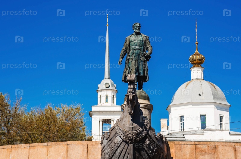 Памятник Афанасию Никитину на одноименной набережной. На заднем плане — церковь Вознесения Господня. Тверь, Россия