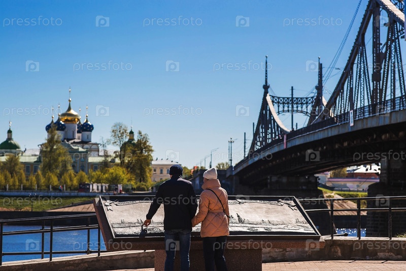 Тверь. Россия. 02 мая 2025 г.: Передвижной дворец, Спасо-Преображенский собор и Старый Волжский мост в Твери