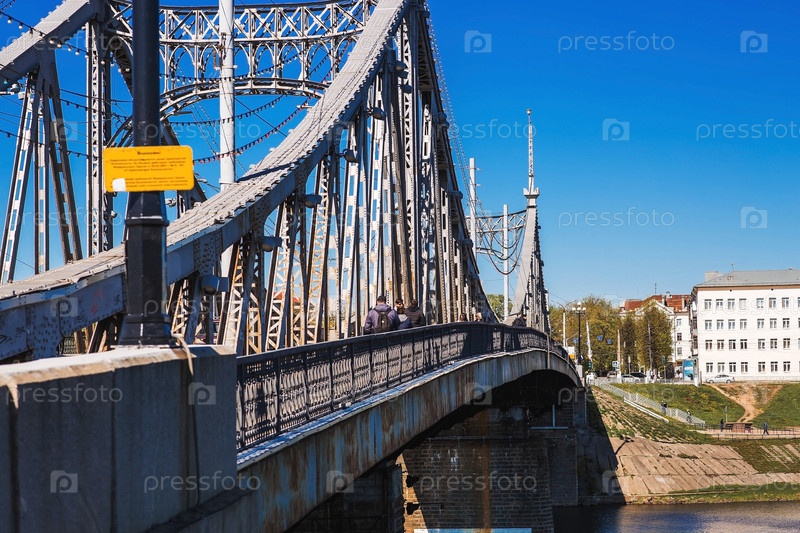 Панорама. Река Волга и старый Волжский мост в центре города. Тверь, Россия