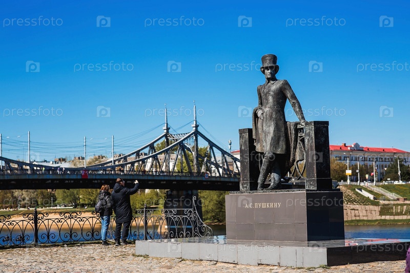 Тверь. Пушкин на мосту. Памятник русскому поэту Александру Сергеевичу Пушкину на фоне старого Волжского моста