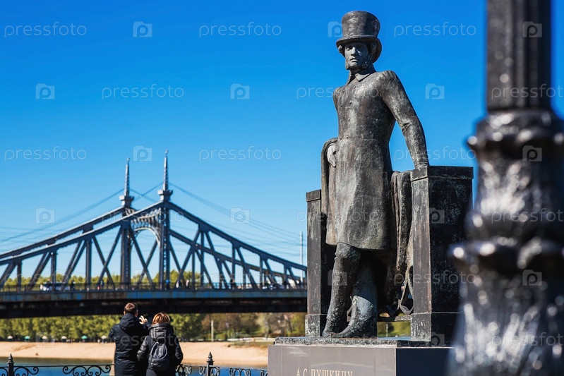 Тверь. Пушкин на мосту. Памятник русскому поэту Александру Сергеевичу Пушкину на фоне старого Волжского моста