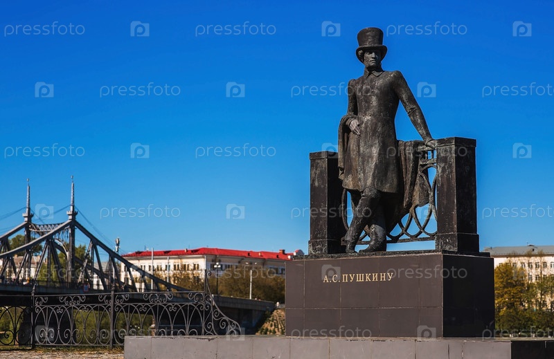 Тверь. Пушкин на мосту. Памятник русскому поэту Александру Сергеевичу Пушкину на фоне старого Волжского моста