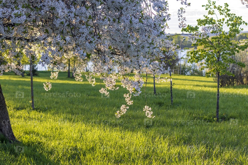 Снимок деревьев в саду, цветущих листьями и цветами. Сезон